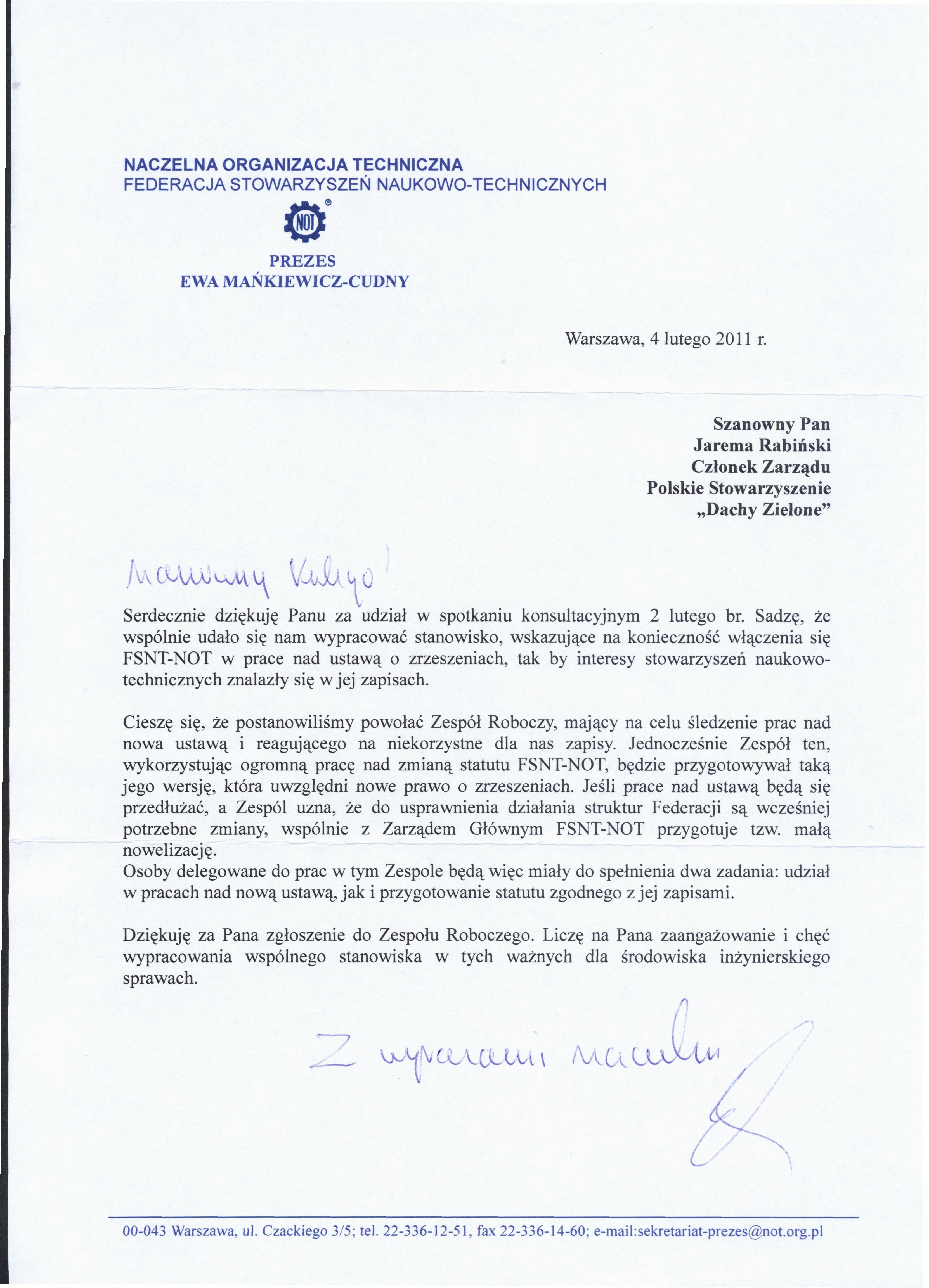 W dniu 2 lutego 2011r. w sali kominkowej Warszawskiego Domu Technika odbyło się spotkanie konsultacyjne Zarządu Głównego FSNT-NOT, na które zostało zaproszone także Polskie Stowarzyszenie ‘Dachy Zielone”. Polskie Stowarzyszenie „Dachy Zielone” na spotkaniu reprezentował Pan Jarema A. Rabiński, który za swój aktywny udział w zebraniu otrzymał oficjalne podziękowania od Pani Prezes FSNT-NOT Ewy Mańkiewicz-Cudny.